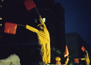 ILLUMINATED WORKINGMAN (1975, 8 minutes, 16mm, color) An Intermedia dance-and-film performance interpreting the movement of people at work, which premiered in 1975 at Niagara Square, Buffalo. The film was projected across a 120-foot-wide screen suspended on the columns of City Hall.